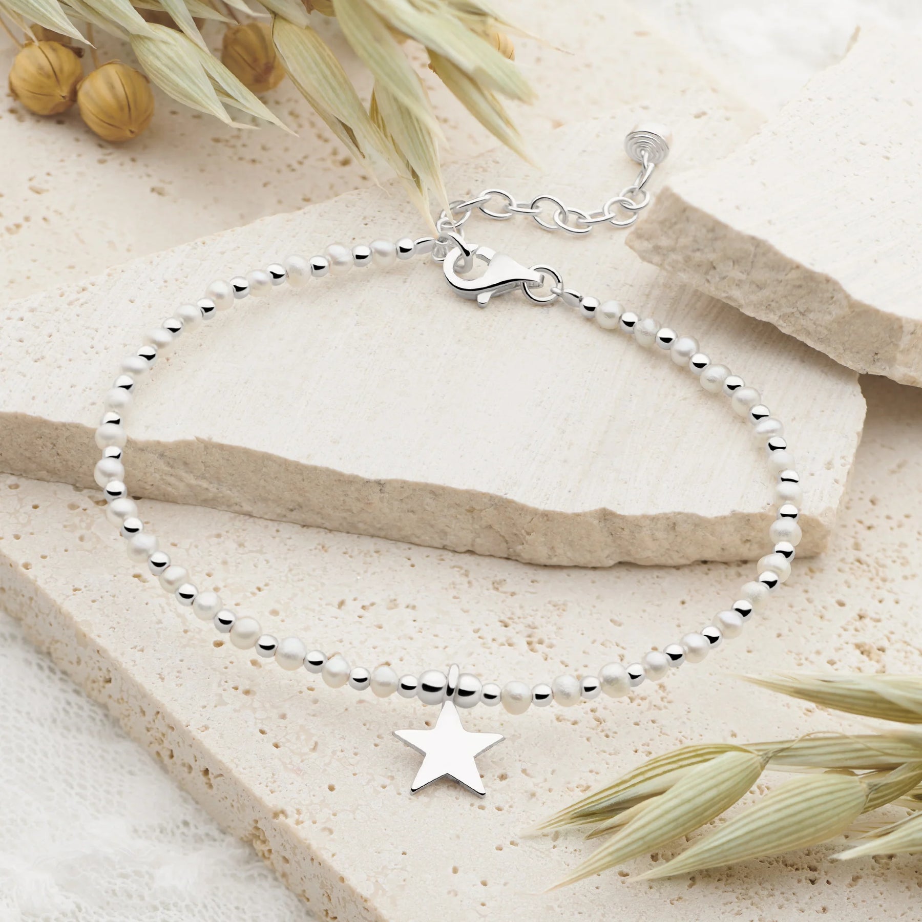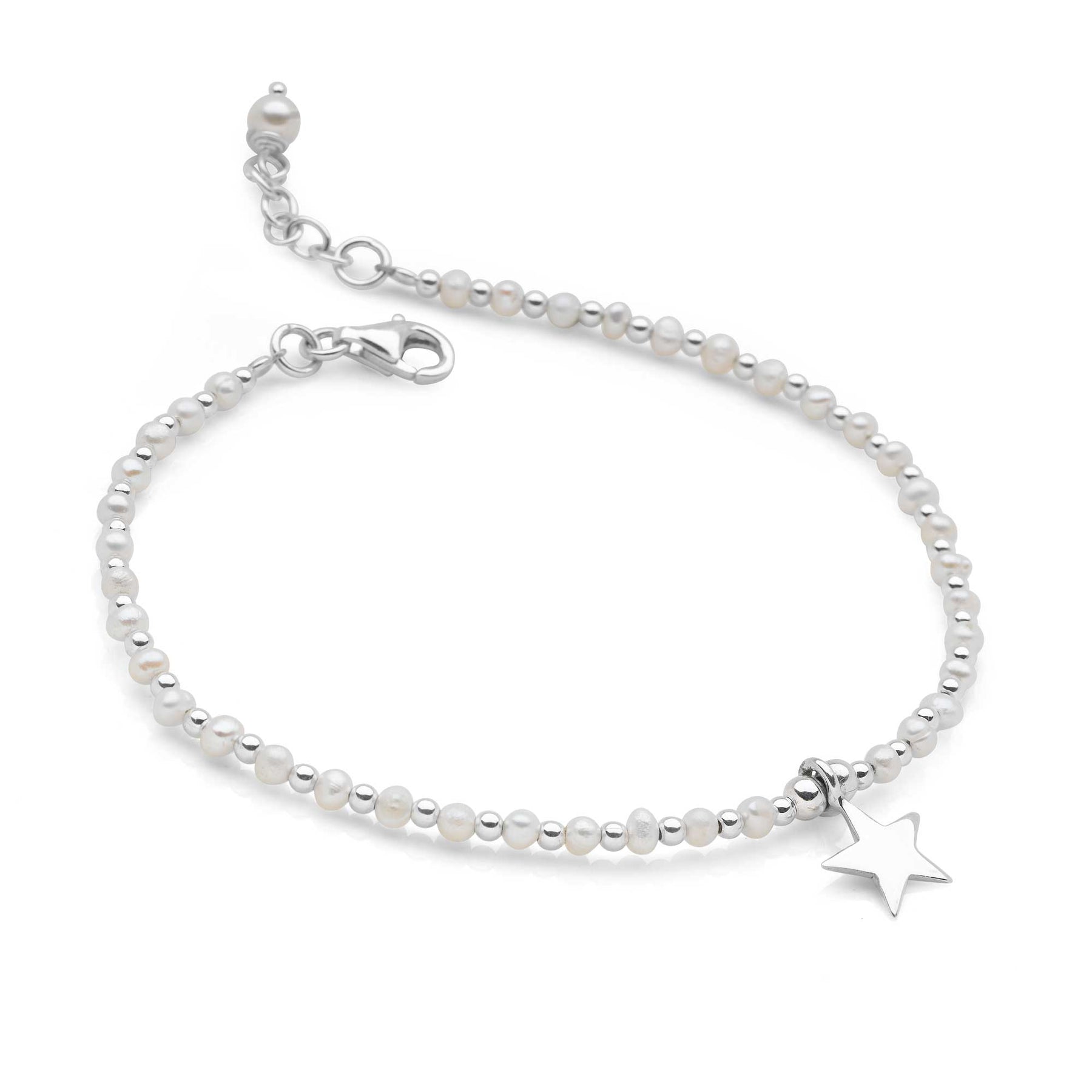 A delicate string of alternating freshwater pearls & silver beads host a pretty shining silver star at it's centre.