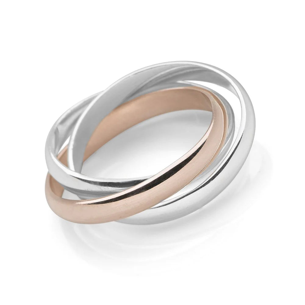 Two high quality sterling silver intertwined bands with a single pale rose gold band represent faith, hope & love. Bring a romantic vibe to all your signature styles with this twist on a vintage classic.